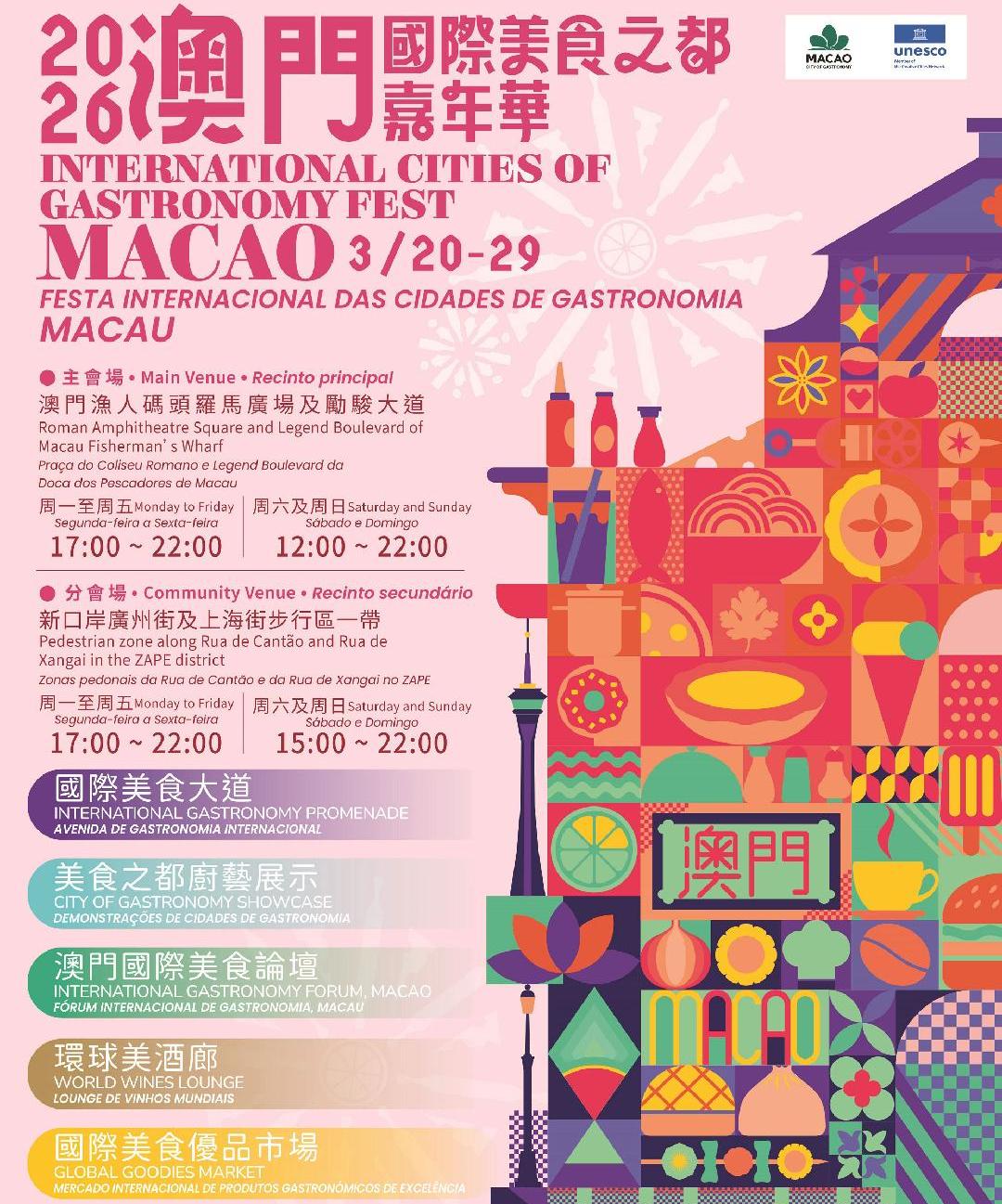 由旅游局主办之“2026澳门国际美食之都嘉年华”于3月20至29日举行,3月20日在澳门渔人码头盛大揭幕。活动汇聚来自全球22个国家共38个联合国教科文组织“创意城市美食之都”...