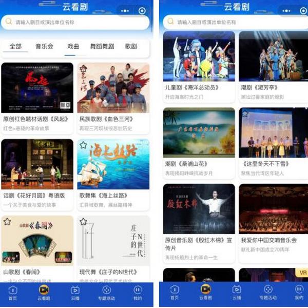 2023年“云剧广东”计划上线百部精品剧目,为大众打造优质的“文化大餐”。目前,平台已经上线话剧《深海》、音乐会《逐浪》、粤剧《东江紫荆红》、舞剧《风雨红棉》、现代舞《九大簋》、歌剧《侨批》等大众喜爱的新创及经典剧目。