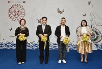 「港彩流金:二十世纪香港彩瓷」展览十二月十八日于香港文化博物馆开幕。图示(左起)香港陶瓷研究会创会会长兼广彩/港彩研究计划统筹严惠蕙、署理康乐及文化事务署副署长(文化)陈承纬、香港陶瓷研究会会长罗士廉和香港文化博物馆总馆长卢秀丽在开幕典礼上合照。