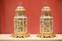 「港彩流金:二十世纪香港彩瓷」展览十二月十八日于香港文化博物馆开幕。图示展览展出仿干隆广彩满大人铜鎏金六角狮头罎。
