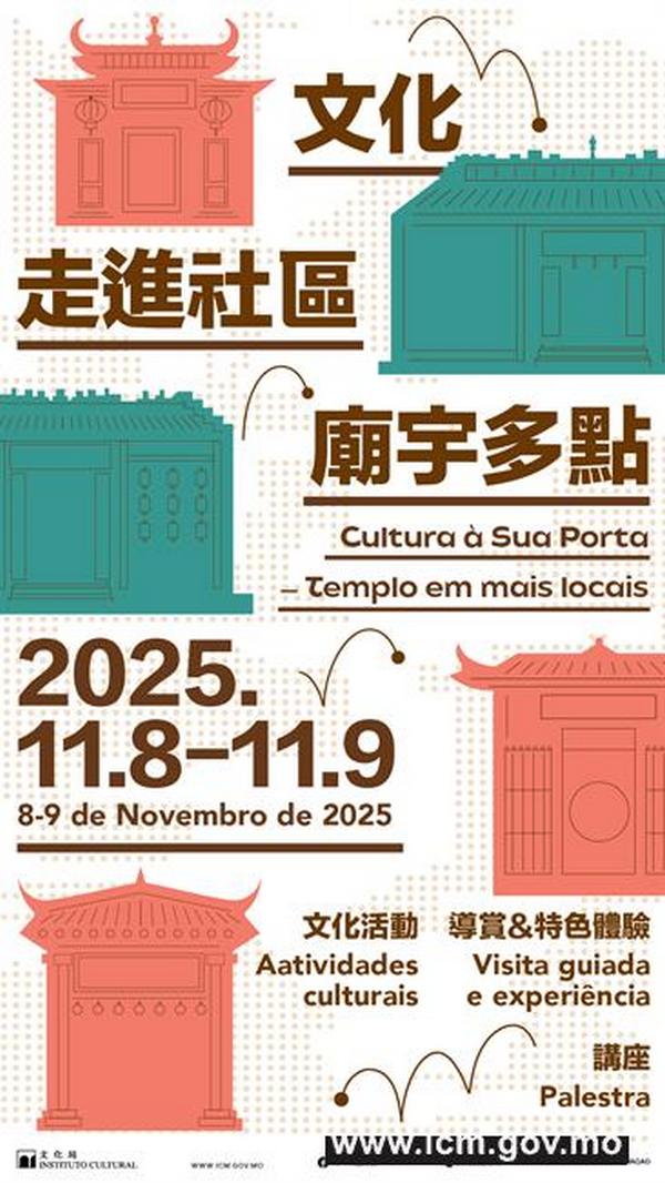 文化局推出以“庙宇多点”为主题的“文化走进社区”活动,於本周六、日(11月8及9日)在全澳16间庙宇前地及周边空间,举办多项非遗及中华文化体验活动。主会场分别设在莲溪新庙前地、北帝庙前地、莲峯庙前地及康公庙前地,届时不同地点将设有“折子戏与南音”“中乐与市集”“舞狮与武术”及“书法与拓印”等特色活动和体验项目。除上述4个主会场外,全澳12所庙宇亦将分别设置“快闪送祝福”站点,提供“手串”“香囊”“漆扇”及“拓印”四项非遗手作体验。同时,现场设有庙宇导赏,以及庙宇角色扮演活动,增添互动趣味与文化氛围。此外,16间庙宇的活动场地均融入全运会元素,邀请居民及旅客拍照留影。活动免费参加,欢迎居民旅客踊跃参与。