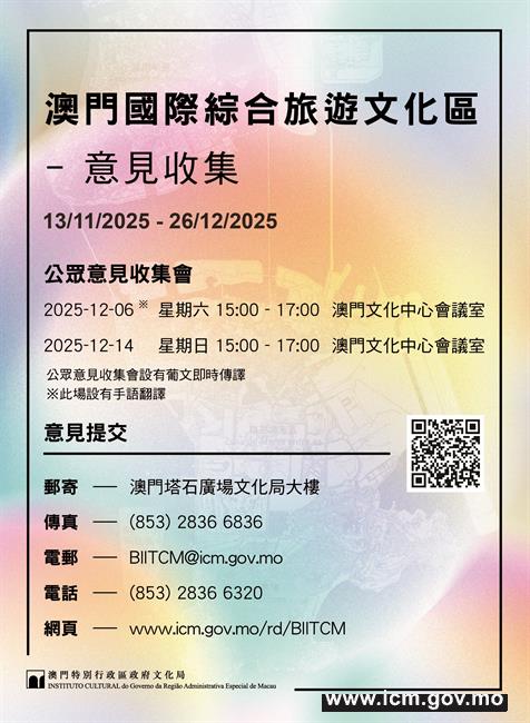 公众意见收集会将分别于12月6日及12月14日下午3时,于澳门文化中心会议室举行。两场意见收集会将提供葡语即时传译,首场同步提供手语翻译,欢迎有兴趣出席的市民,自11月29日起透过专题网页(www.icm.gov.mo/BIITCM)报名。