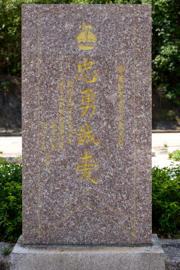 纪念碑旁刻有「忠勇诚爱」四字的石碑,以纪念抗战胜利后,英军代表李芝上将颁赠西贡乡民的「忠勇诚爱」纪念锦旗,摄于二○二五年。©古物古迹办事处