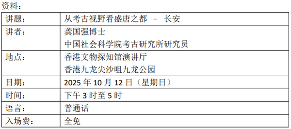 为配合由现在起至12月31日在香港文物探知馆举行的「唐风万里:多元交融开放的盛世」展览,发展局古物古迹办事处邀请文博机构的专家学者举办公众讲座,介绍唐代在政治、社会及文化发展,以及当时的建筑和唐代相关考古发现等,以展现大唐盛世的独特魅力。