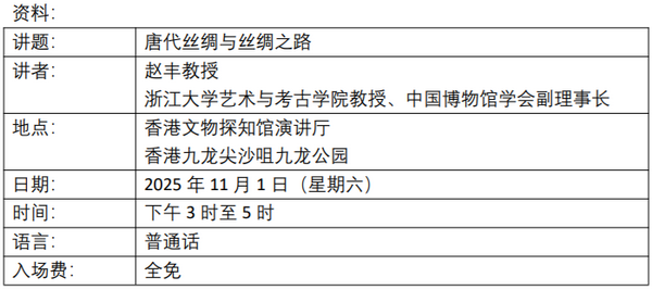 为配合由现在起至12月31日在香港文物探知馆举行的「唐风万里:多元交融开放的盛世」展览,发展局古物古迹办事处邀请文博机构的专家学者举办公众讲座,介绍唐代在政治、社会及文化发展,以及当时的建筑和唐代相关考古发现等,以展现大唐盛世的独特魅力。