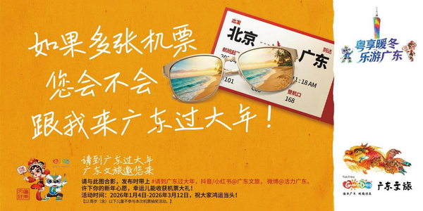 1月4日至3月12日,广东文旅联合航司推出机票赠送活动,市民游客可通过在北京、上海、哈尔滨机场以及北京、上海地铁线下打卡广东文旅宣传广告牌,发布活动相关的图文/短视频内容到个人社交媒体平台,带上话题#请到广东过大年,抖音或小红书@广东文旅,微博@活力广东,参与者有机会获得北京/上海/哈尔滨飞往广州/深圳的机票。