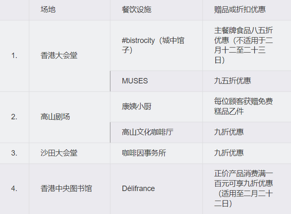 二月六日至三月二十二日期间,博物馆通行证持有人于以下康文署辖下场地餐饮设施消费可享赠品或折扣优惠: