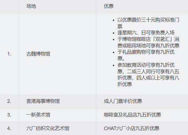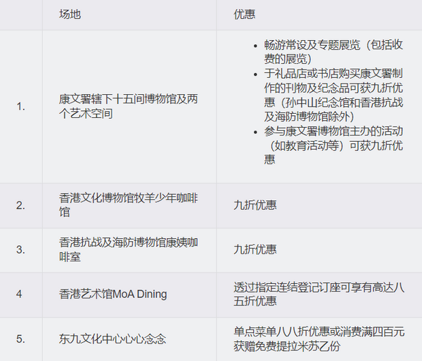 博物馆通行证全年提供多项优惠。康文署辖下场地及活动的优惠如下︰