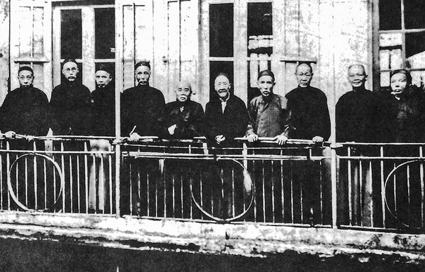 Scholars of the former Qing Hanlin Academy who taught in Hok Hoi Library, photographed at the library’s Bonham Road premises in 1936. From left: Wen Su, Cen Guang-yue, Chen Nian-dian, Ou Da-yuan, Lai Tsi-hsi, Zhou Ting-gan, Ou Da-dian, Zhu Ru-zhen, Zuo Pei and Chen Yu-xiang.©Hok Hoi Library