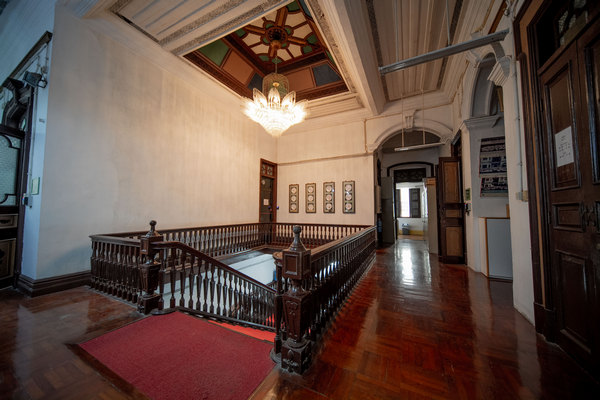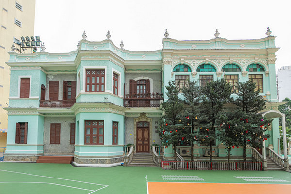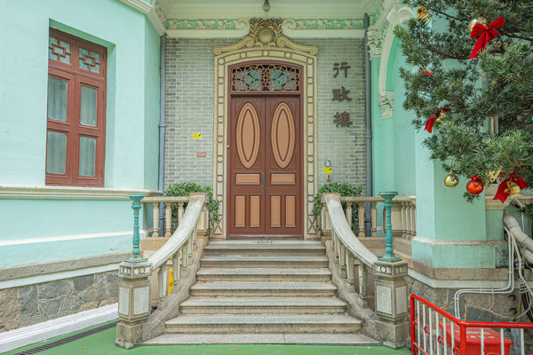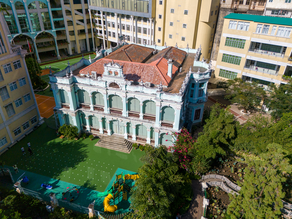 The current administrative building of Macao Pui Ching Middle School was the former private residence and the main building of the Lou family’s Garden. The building’s exterior features baroque architectural elements, with intricate scrollwork and volutes on the upper façade, and a wavy parapet. The interior of the building is richly decorated with both Chinese and Western ornamental motifs.