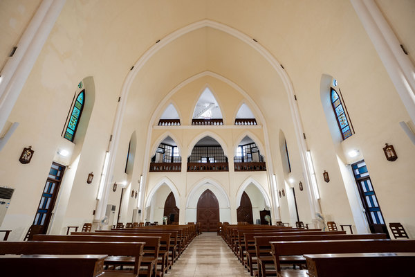 From 1929 to 1934, the old building was rebuilt into the Hall of Faith, and the church was completed in 1936. The Hall of Faith has a classical eclectic style with a circular pediment on the top. The design of the building emphasizes horizontality, with light gray exterior and dark wooden louvred doors and windows, contrasting with the adjoining tall church. The church has a Gothic architectural style, with a Latin cross floor plan, a pointed-arched doorway. The main façade features a tall spire and bell tower, and a pavilion with an octagonal roof situated on top of the bell tower, giving it a simple yet solemn appearance. The Hall of Faith and the Church are iconic structures of the school alongside the over 300-year-old stone staircase.