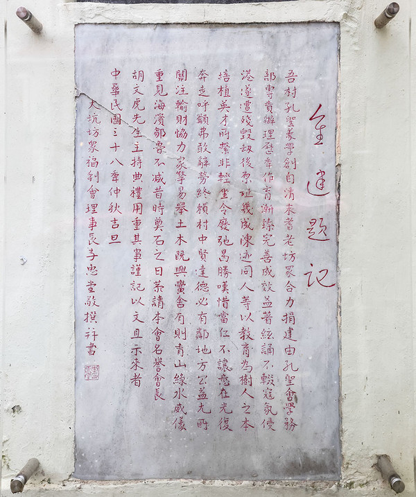 During the Japanese Occupation, Hung Shing Yi Hok was severely damaged. After the war, the number of out-of-school children in Tai Hang soared. Through local donations by Tai Hang Residents’ Welfare Association, which 32,000 Hong Kong dollars was collected in the fundraising campaign, and 10,000 Hong Kong dollars from Aw Boon-haw, a Chinese entrepreneur and owner of Haw Par Mansion, in 1949, the free school was rebuilt on the same site. Aw’s son, Aw Hoe, also contributed and purchased desks and chairs for the school. The foundation ceremony was held on 14 August 1949, presided over by Aw Boon-haw. Also attending the ceremony was prominent retired football player and President of Tai Hang Residents’ Welfare Association, Lee Wai-tong. On 20 November of the same year, the opening ceremony of Hung Shing Yi Hok was held,with Aw Hoe, Lee Wai-tong and Sin Pui-kwan, Vice President of Tai Hang Residents’ Welfare Association, as officiating guests. Outside the original main entrance is a stone plaque, with the inscription Chong Jian Ti Ji (tablet to commemorate the rebuilding), written by Lee Wai-tong in 1949 to commemorate the reconstruction of the free school.