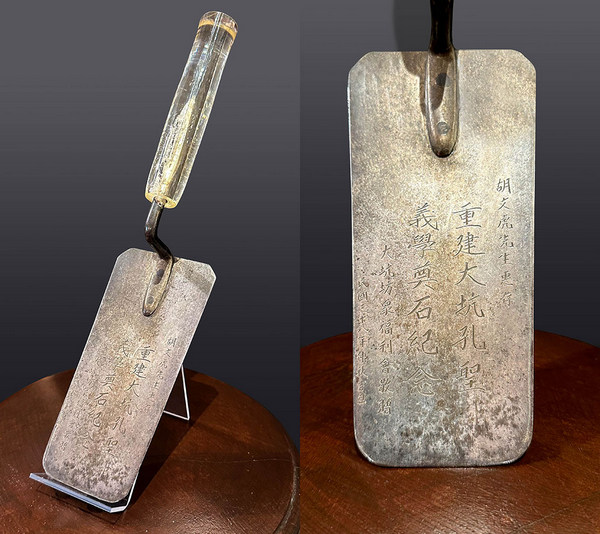 Commemorative shovel for the foundation ceremony of Hung Shing Yi Hok, presented to Aw Boon-haw by the Tai Hang Residents’ Welfare Association in 1949.©Antiquities and Monuments Office