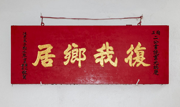 This plaque, with the inscription Fu Wo Xiang Ju (restored my home) preserved in Chou Wong Yi Kung Study Hall, praises the contribution of Zhou and Wang to the lifting of the Coastal Evacuation Edict, 2022.©Antiquities and Monuments Office