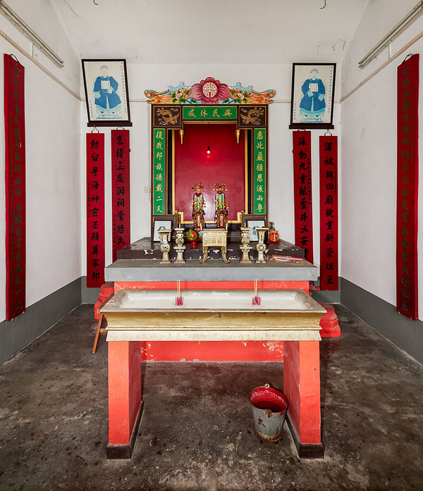 The soul tablets of Zhou and Wang are revered in the main bay of the rear hall of Chou Wong Yi Kung Study Hall. The couplets on both sides of the altar, along with a horizontal scroll, express the gratitude and respect Kam Tin residents have for Zhou and Wang, 2024.©Antiquities and Monuments Office