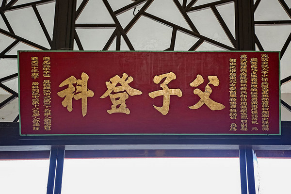 This plaque in the front hall, with the inscription Fu Zi Deng Kei (father and son enter officialdom), was presented by the Viceroy of Guangdong and Guangxi, Ruan Yuan, and the Governor of Guangdong, Yi Liang, to congratulate Tang Mingluen and his son, Tang Ting-chu, on passing the military Imperial Civil Service Examinations as wujuren in the first and twentieth years of Daoguang reign of Qing dynasty (1821 and 1840) respectively, 2015.©Antiquities and Monuments Office