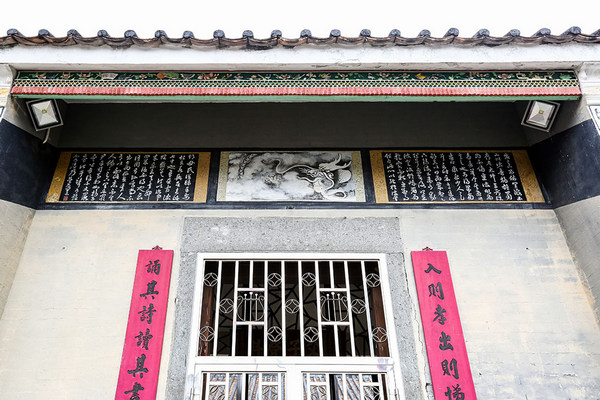 So Lau Yuen is a Lingnan traditional grey-brick building in a two-hall-three-bay layout. The walls and ridges are adorned with plaster mouldings depicting auspicious plants and animals; and the main façade is decorated with mural paintings featuring auspicious patternsand calligraphy, reflecting the artistic characteristics of Lingnan traditional architecture. The calligraphy on the plaque at the entrance of So Lau Yuen was written by Tang Ying-yuen who passed the military Imperial Civil Service Examinations as wujuren in the fifty-fourth year of Qianlong reign of Qing dynasty (1789). Tang lent his calligraphy works to various traditional buildings in Kam Tin, and sponsored the compilation of Xin’an Xianzhi (Gazetteer of Xin’an County) in the twenty-fourth year of Jiaqing reign of Qing dynasty (1819). His contributions to the region were immense.