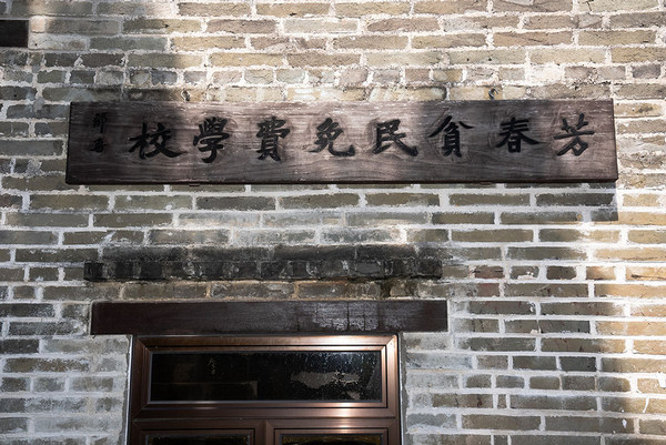 Wooden plaque with the inscription "Fong Chun Free School for the Poor” still hung on the exterior wall, 2024.©Antiquities and Monuments Office