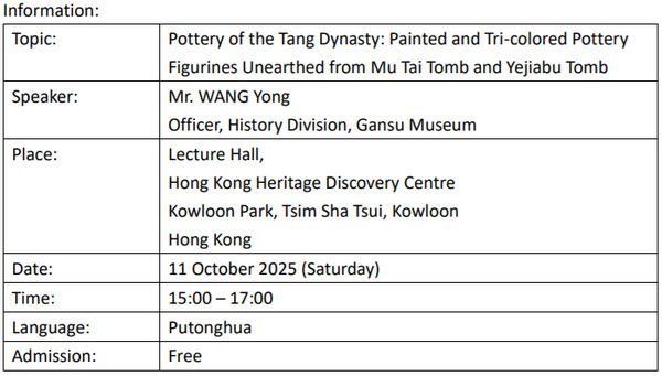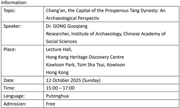 To complement the “Tang Vogue Beyond the Horizons: A Golden Era of Multicultural Integration and Openness” exhibition currently staged at the Hong Kong Heritage Discovery Centre until 31 December 2025, the Antiquities and Monuments Office of Development Bureau has invited experts/scholars from various cultural institutions and museums to conduct public lectures on topics related to political, social and cultural development of Tang dynasty, architecture of the time and archaeological findings related to Tang dynasty, to introduce the unique charm of the golden era of Tang dynasty.