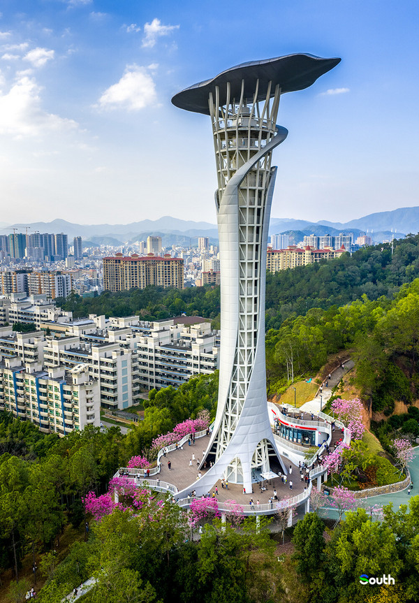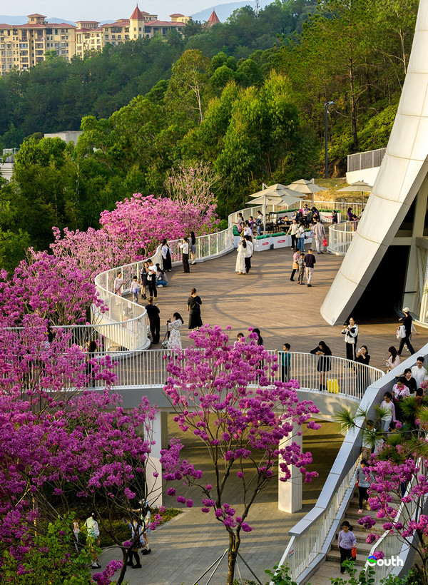 A newly built city landmark in Xinyi, a county in Maoming, Guangdong province, has become a seasonal attraction as fields of purple golden bell flowers come into full bloom. The flowers surround Liuyun Pavilion (流云阁), creating a striking contrast with its modern design. Taking advantage of the area's mild winter climate, residents and visitors have been gathering at the site to stroll, take photos and enjoy the scenery.