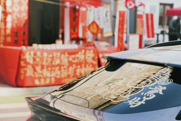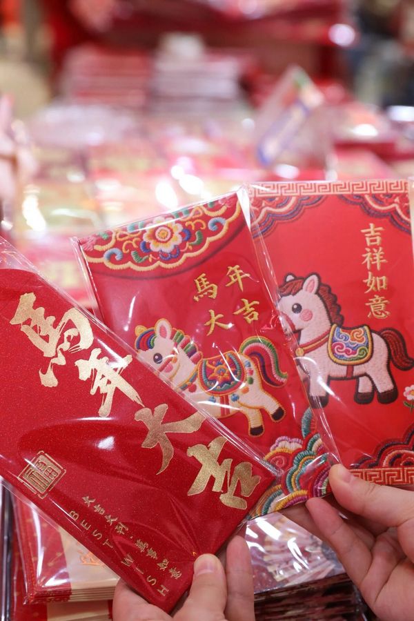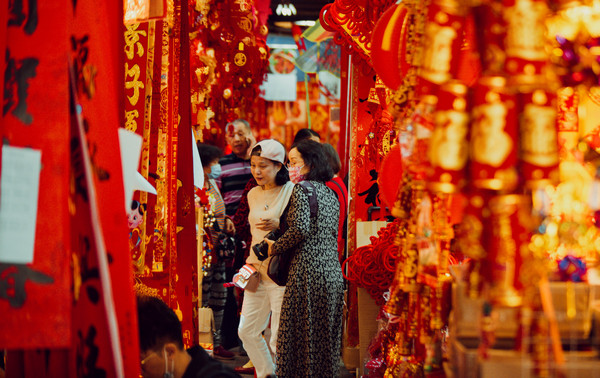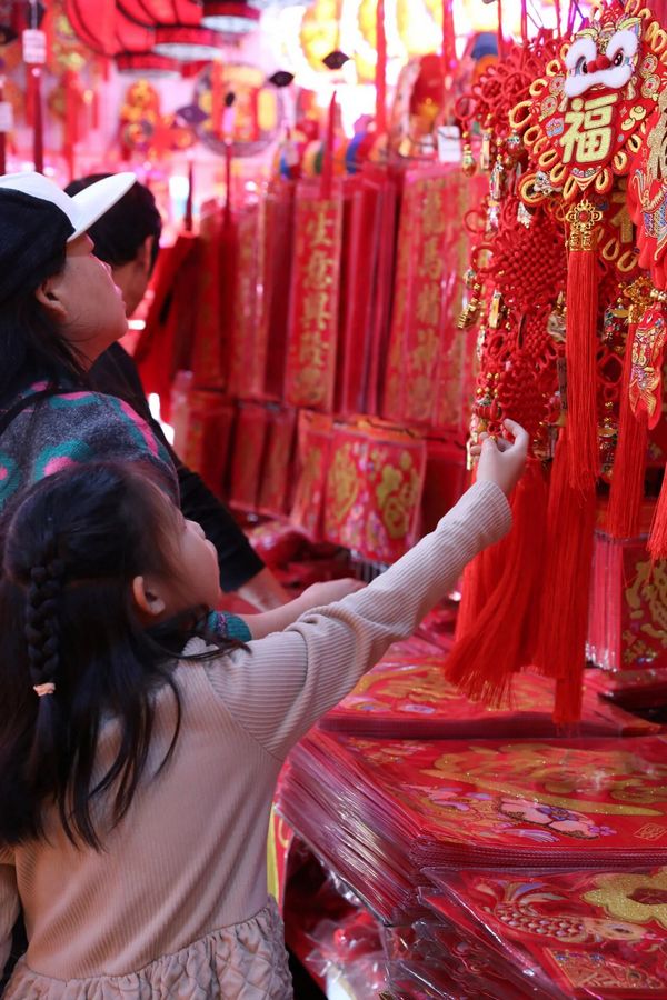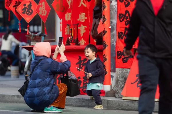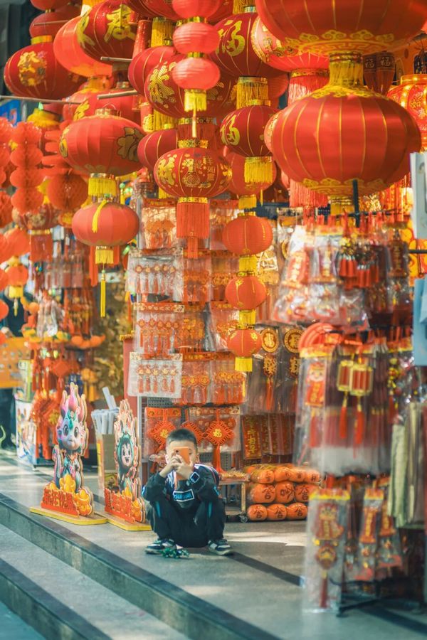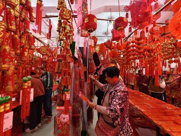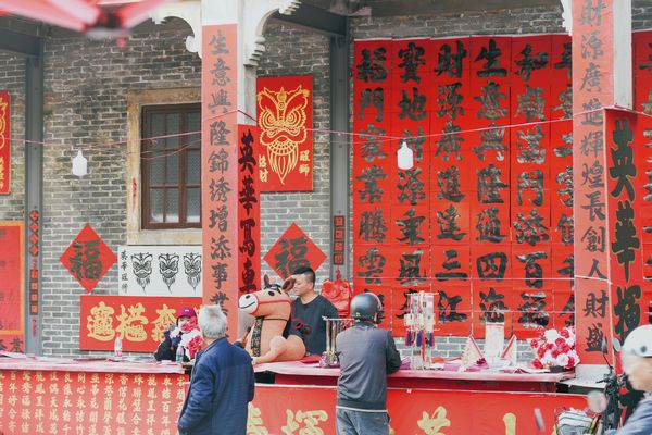 Kuaizi Road near Foshan's Zumiao area transforms into a sea of red. The street is famous for Fai Chun—handwritten festive couplets and blessing phrases traditionally brushed on red paper. Browsing and choosing a few pieces of calligraphy here has long been a festival ritual for local families.